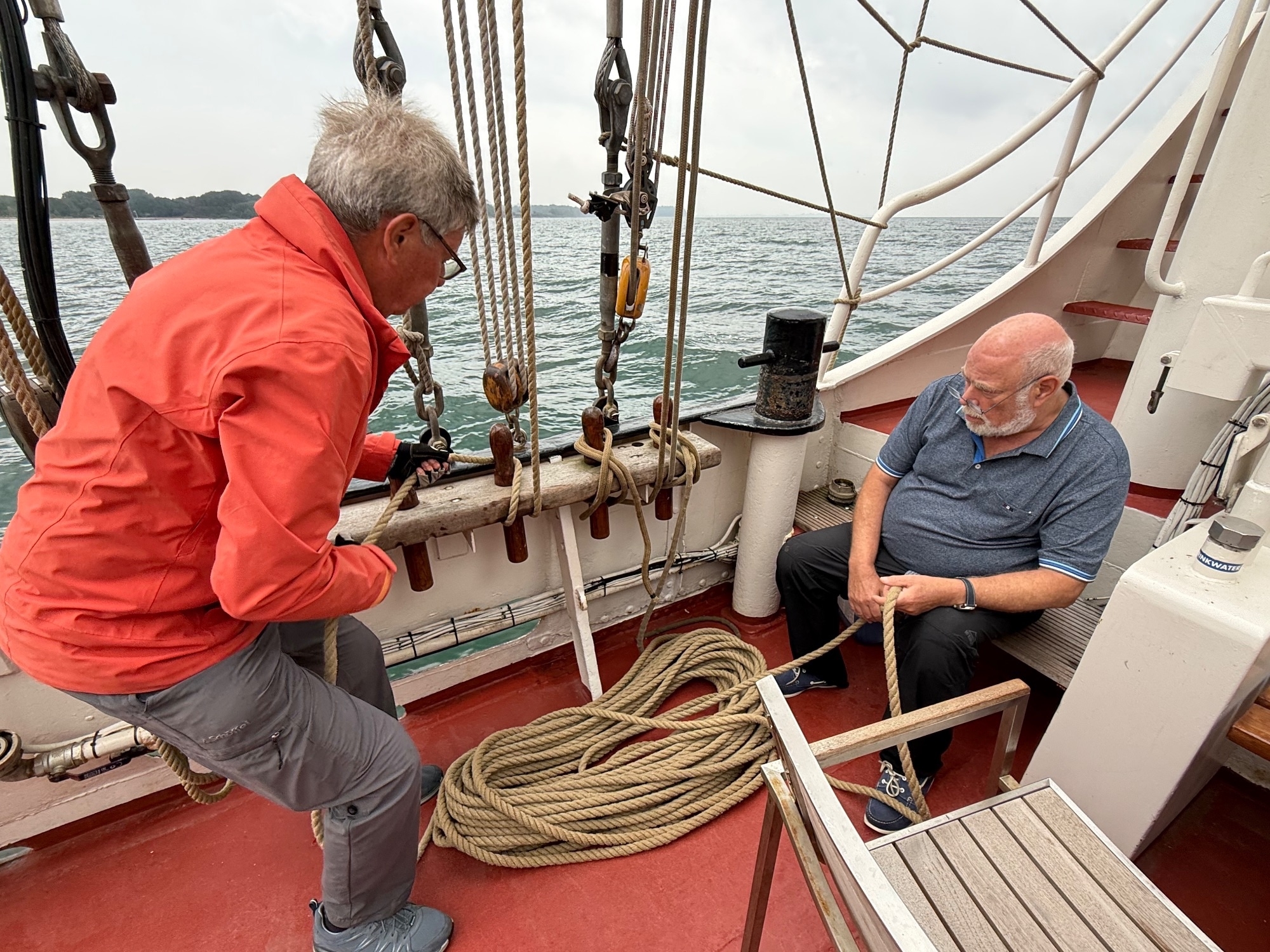 Nach kurzem Morgenregen bessert sich das Wetter, so dass wir nach dem Austritt aus dem Svendborg-Sund eine weiteren schönen Segelschlag nach Sønderborg geniessen können. Wir legen unmittelbar beim Schloss an und bleiben dort nicht lange allein. Die Dreimasterbark (ehemaliger Walfänger) Artemis und die Drei-mastbarkentine (ehemaliges Fischereischiff) Antigua leisten uns Gesellschaft. Abends singt dort ein Shanty-Chor, danach lassen wir von Jeroens Ausführungen über die Renovation der Abel Tasman beeindrucken. Er hat mit seinem Team das Schiff ziemlich vollständig ausgeräumt, im Rumpf Schwachstellen behoben und anschliessend so gut wie alles neu eingebaut. Dabei waren gleichermassen sein handwerkliches Geschick, technischen Fachkenntnisse und administrative Fähig-keiten für die erfolgreiche Bewältigung einer Flut von Vorschriften und amtlicher Kontrollen gefragt.